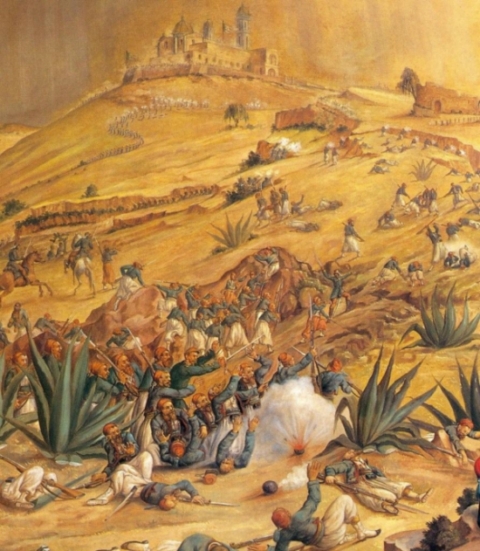 Los «zuavos» (regimiento de infantería francesa) ascienden hacia el Fuerte de Guadalupe, perdiéndose de la vista de los fusileros mexicanos. De repente, aparecen frente al Fuerte de Guadalupe, el cual rompe fuego de fusil sobre la columna, que para en seco ante el fuego mexicano.