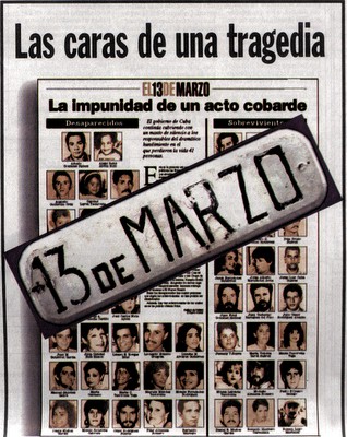 Hoy todas las banderas deberían estar a media asta, porque ningún adulto, ni pequeño o joven cubano puede comentar tranquilo esta fecha, cuando recuerda la masacre del 13 de julio de 1994, en el Remolcador 13 de Marzo, en donde 41 personas perdieron la vida, vilmente, a manos de servidores del régimen castrista, comandados y enviados por el “tiranosario”  Fidel Castro, que con esa canallesca “fechoría”, quiso dar un ”escarmiento” a todos los descontentos, y vaya si lo dio. Hoy rememoramos la fecha, a dieciséis años de esta masacre, que marcó, junto a la del Río Canímar, lo inhumano de un régimen terrorista, que no valora realmente a los cubanos, y que con dichas acciones ha demostrado de lo que son capaces los castristas, ante un pueblo indefenso, condenado a permanecer inerme, ante sus andanadas y atropellos, como igualmente ocurre en el caso de las recientes excarcelaciones de presos políticos, inmersas dentro de un panorama de franca  represión y depresión, dentro de un país que no soporta más humillación, ni menosprecio de su movimiento opositor, diezmado de esta manera, para que los hermanos Castro logren nuevamente un desahogo de la crisis política, que ellos mismos han generado, y de la que no saldrán, hasta que actúen con transparencia y reconozcan su doble moral e insana confabulación con los cómplices de su dictadura feroz.