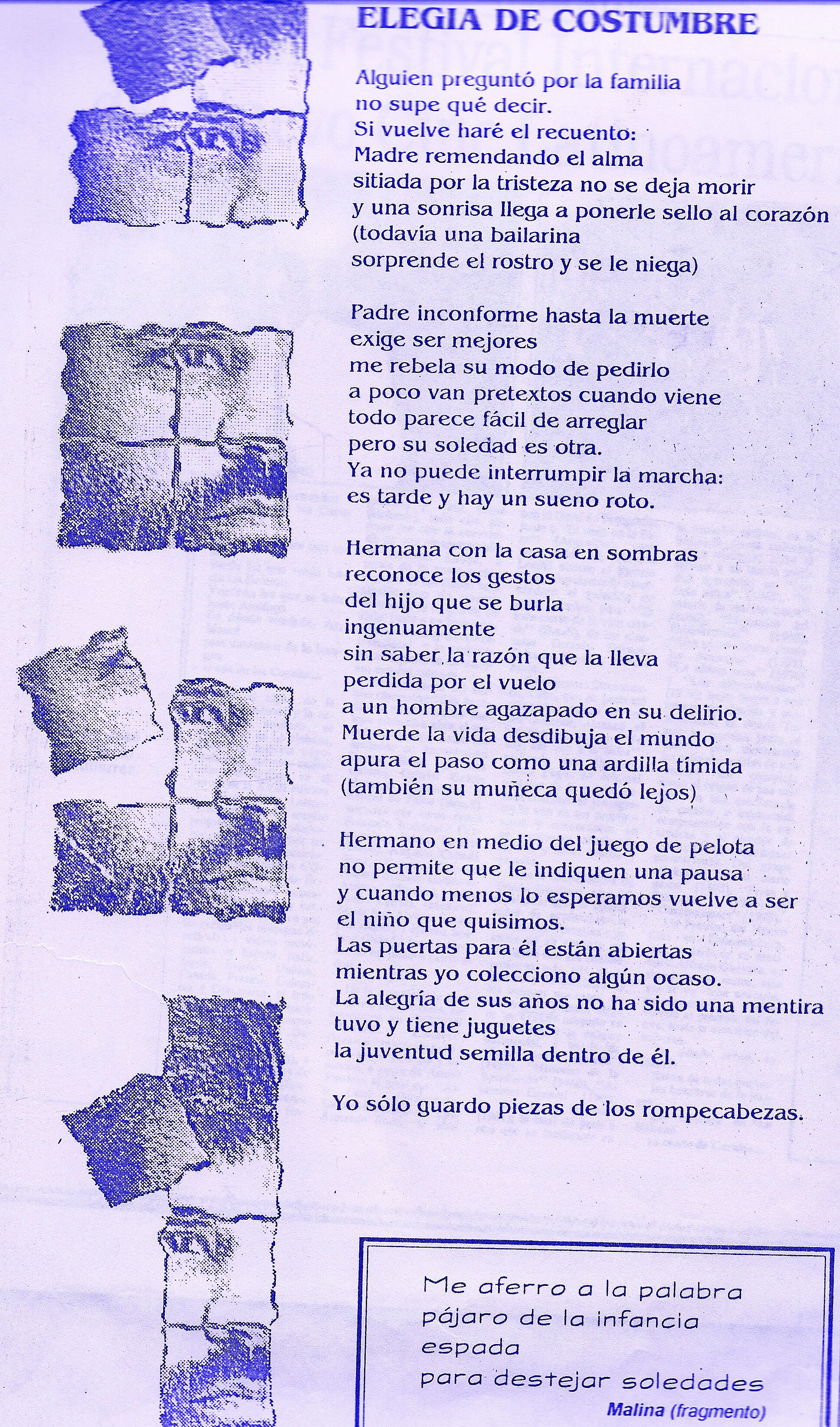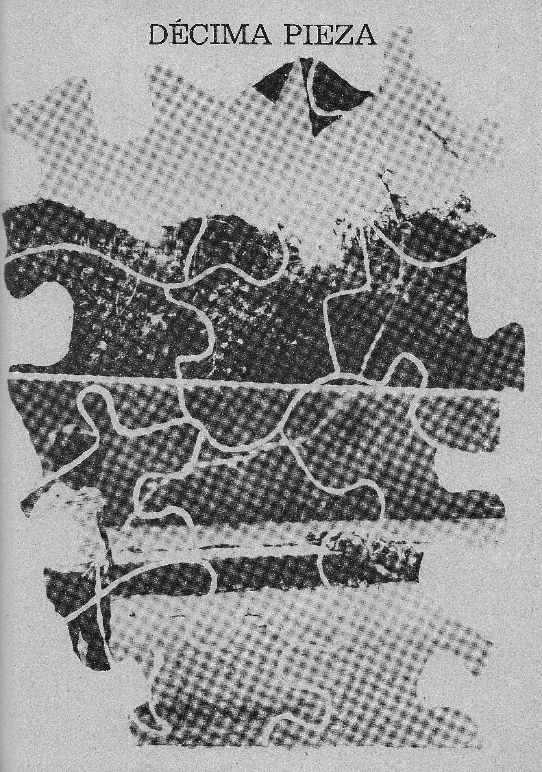 Ahora les presentaré las décimas primera y la última, junto a las diferentes piezas del poema que luego se arma al final, además de muchas de las imágenes que conforman el diseño general de Rompecabezas, en espera de que muy pronto pueda mostrarles una nueva edición de este poemario, que considero, no sólo sui géneris, dentro de mi creación, sino capital, para estudiar las diversas tendencias poéticas, que luego tienen lugar en mi obra, como parte de una generación, que integran los nacidos en Cuba, después de 1959.