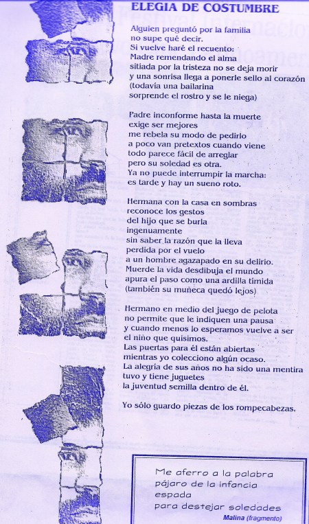 Desde ese instante, Rompecabezas empezó a transitar su nefasto camino editorial, debido a su condición misma de cuaderno sui generis, ya que al poseer una estructura, como el nombre lo indica, se divide en piezas, con una imagen central, que se va armando, y que compone la lírica del poeta, al concluir el poemario, ello exigía un tamaño diferente al previsto para este tipo de colección, primer impedimento con el que contó mi libro, desde el principio.