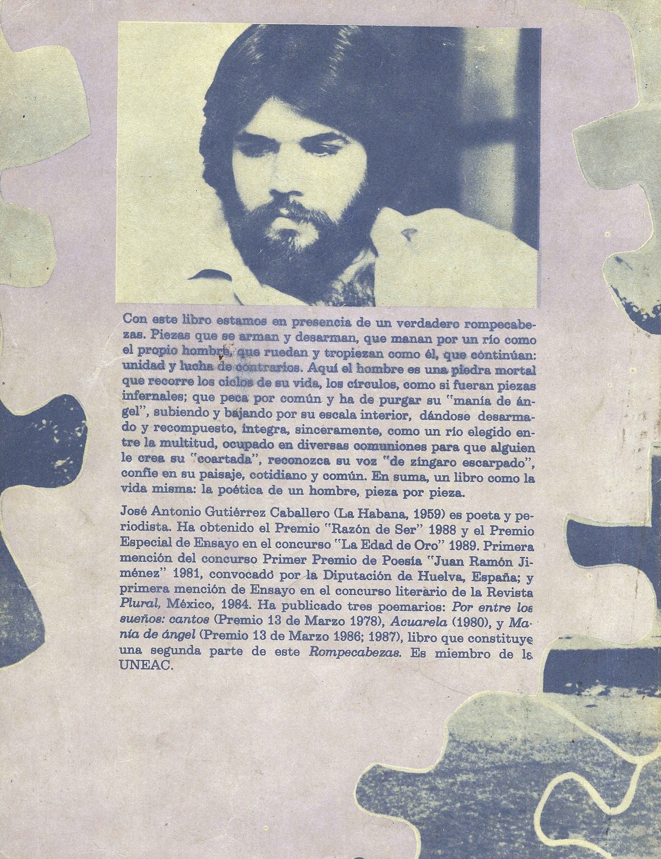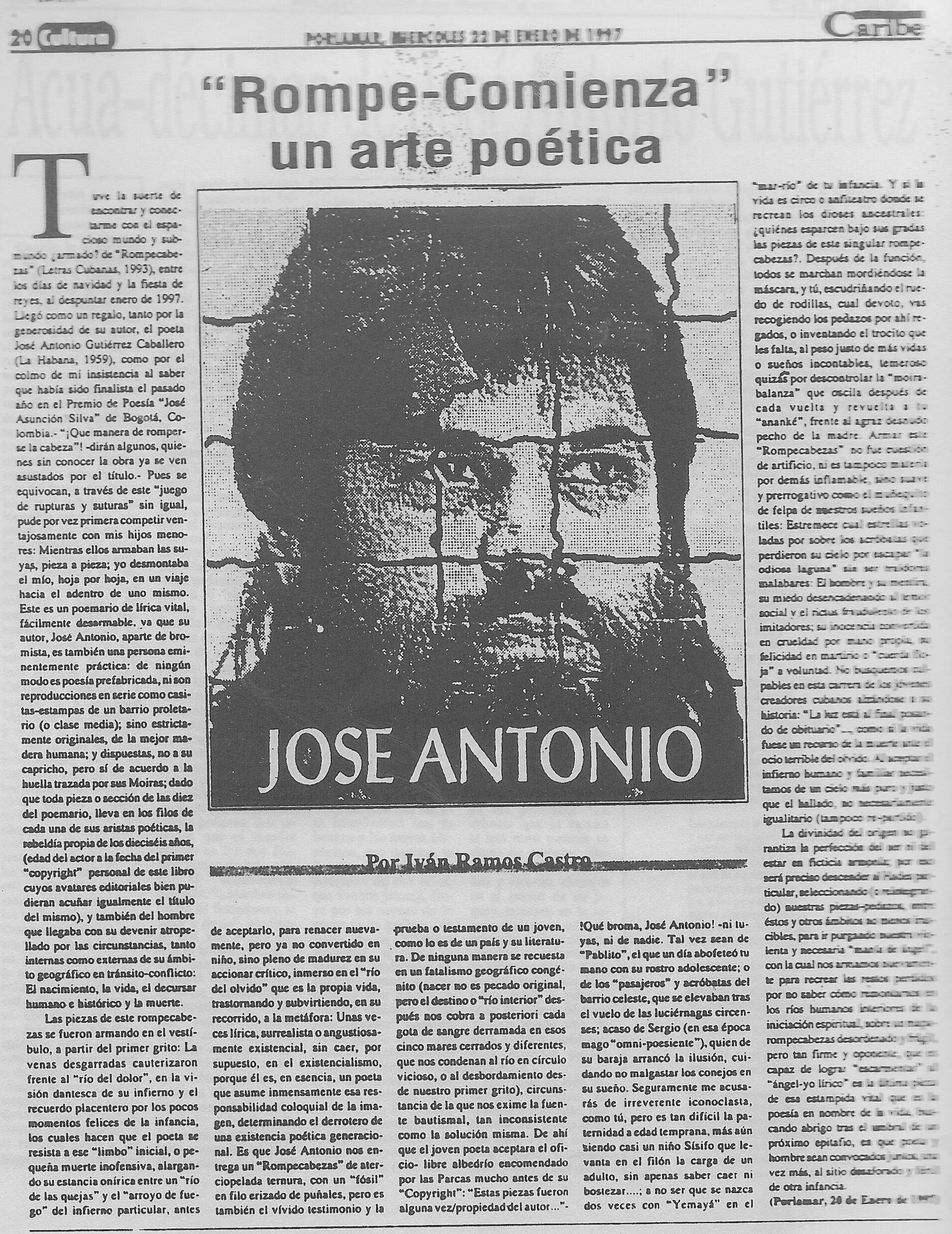 “Con este libro de José Antonio Gutiérrez Caballero, estamos en presencia de un verdadero Rompecabezas. Piezas que se arman y desarman, que manan por un río, como el propio hombre, que ruedan y tropiezan como él, que continúan: unidad y lucha de contrarios. Aquí el hombre es una piedra mortal que recorre los ciclos de su vida, los círculos, como si fueran piezas infernales: que peca por común y ha de purgar su “manía de ángel”, subiendo y bajando por su escala interior, dándose desarmado y recompuesto, íntegra, sinceramente, cual un río elegido entre la multitud, ocupado en diversas comuniones, para que alguien le crea su “coartada”, reconozca su voz “de zíngaro escarpado”, confíe en su paisaje, cotidiano y común. En suma, un libro como la vida misma: la poética de un hombre, pieza por pieza”.