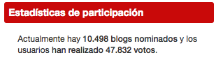 “Terminamos la semana con una estupenda noticia: en poco más de un mes desde el inicio del proceso de votaciones en los Premios Bitácoras, ya hemos superado ampliamente las cifras de participación de ediciones anteriores. Concretamente, en el momento de publicar esta anotación, 10.498 blogs han sido nominados y los usuarios habéis emitido 47.832 votos. (Las cifras finales en 2009 fueron de 8.457 bitácoras nominadas y 37.141 votos)”.