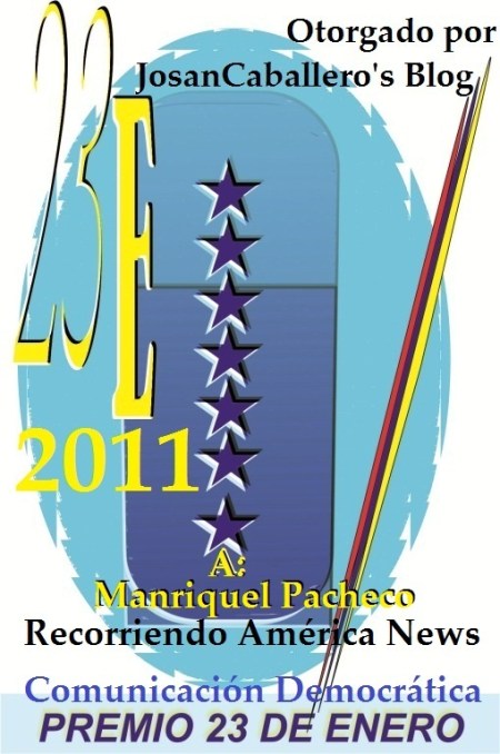 Hace muy pocos días, Manriquel Pacheco recibió el Premio de Periodismo Democrático 23 de Enero 2011, junto a otros colegas, de manos del escritor y periodista José Antonio Gutiérrez Caballero (Josán Caballero), galardón del cual se comenta, en este número 28, que acaba de colocarse, gratuitamente, en los estanquillos de las instituciones afiliadas, por toda la Ciudad del Sol, para que usted también pueda disponer de su lectura.